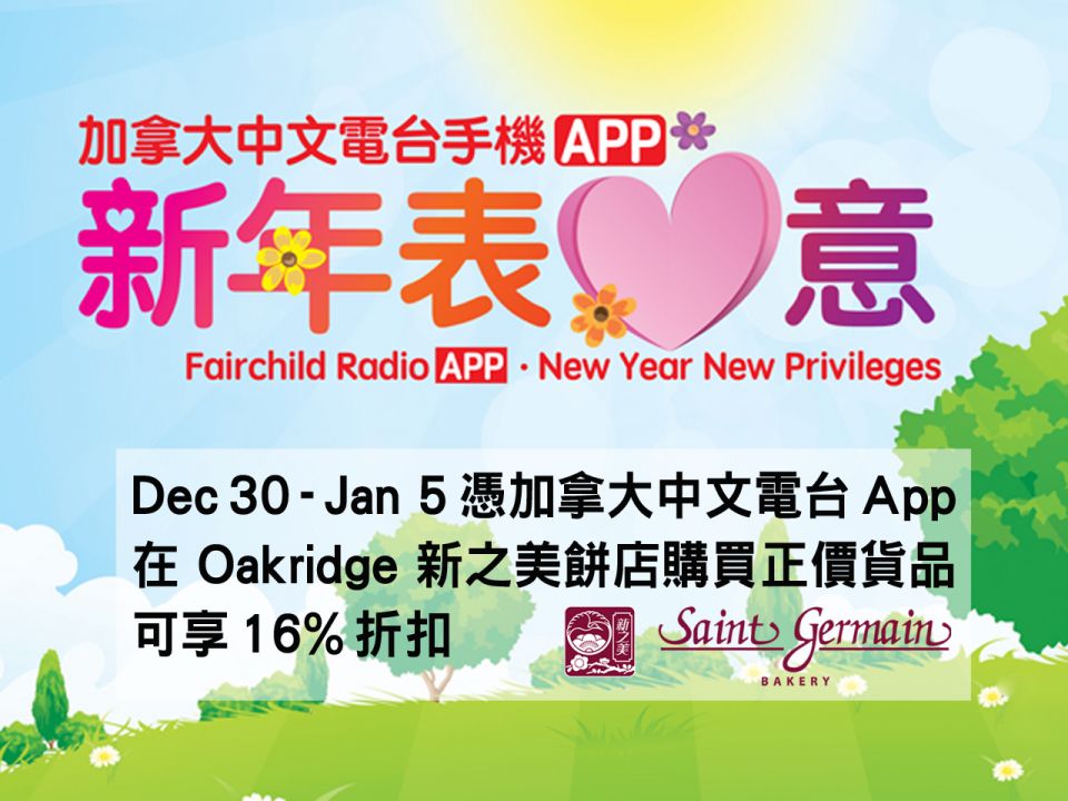 Starting from Dec 16 for 8 weeks, Fairchild Radio App users will enjoy exclusive privileges! Simply download the FREE Fairchild Radio App on your smart phone, and shop at the specified shop during the specified period. When ready to pay, show your smart phone with the Fairchild Radio App to the cashier, and you can enjoy the specified shopping benefits. The participating shop, location and benefits will be updated week. This week (Dec 30, 2019 - Jan 5, 2020), you can enjoy 16% discount off all regular price items at St Germain Bakery at Oakridge Centre!
