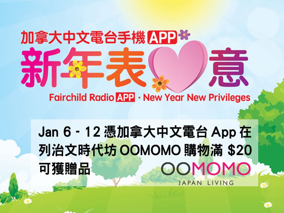 2020 有禮!加拿大中文電台手機 App,新年好禮第一擊,為你送上 OOMOMO 精美禮品!從今天起到 1 月 12 日(星期日),在列治文時代坊的 OOMOMO 購物滿 $20(稅前消費),即可免費獲贈禮品一份!