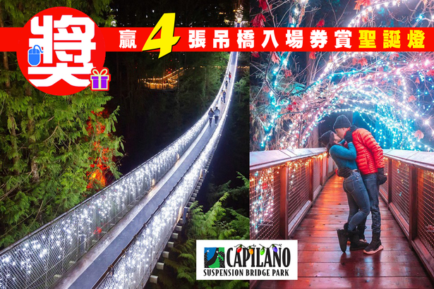由今天起至 12 月 10 日,只需按本文最下方的連結直達遊戲版面,再回答一條簡單的選擇題,就有機會贏取 Capilano Suspension Bridge Park 成人入場券 4 張,可自選日期參觀吊橋美景,並飽覽園內瑰麗的聖誕燈飾展 Canyon Lights,總值 $216!