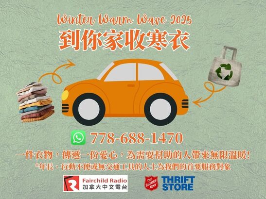 自1995年首次舉辦以來,「寒衣送暖流」已成為大溫地區最具代表性的愛心活動之一,累積無數善長的溫情捐贈,讓社區充滿關懷。今年,我們迎來活動的第31屆,更希望藉此讓愛心延續、讓暖意加倍。 為了使更多人輕鬆參與,今年「寒衣送暖流」除了設置多個收集點外,大受歡迎的「到你家收寒衣」服務亦再度回來,讓年長者、行動不便或缺乏私人交通工具的朋友,也能在家輕鬆回饋社會。
